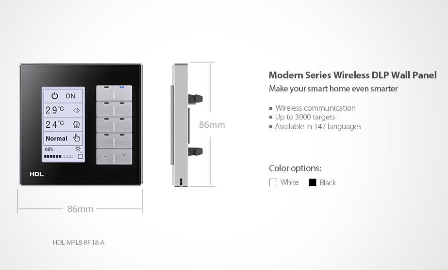 HDL-MPL8-RF.18-A 8-button wireless panel is a new generation of wall-mounted switch with new design. It has 8 control buttons and the left & right side of the button can be programmed separately. 2 buttons are used for the page switching. Each button can be displayed with an icon in the LCD screen, which is customized for final user.